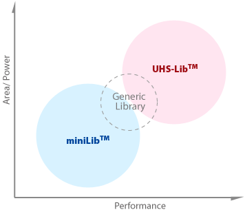 The cell libraries include the generic, ultra-high-speed library (UHS-Lib), and mini-library (miniLib). The ultra-high-speed library (UHS-Lib) is optimized for high speed applications, such as CPU, GPU and DSP, whereas the miniLib is designed for low power, small size applications, such as portable devices.